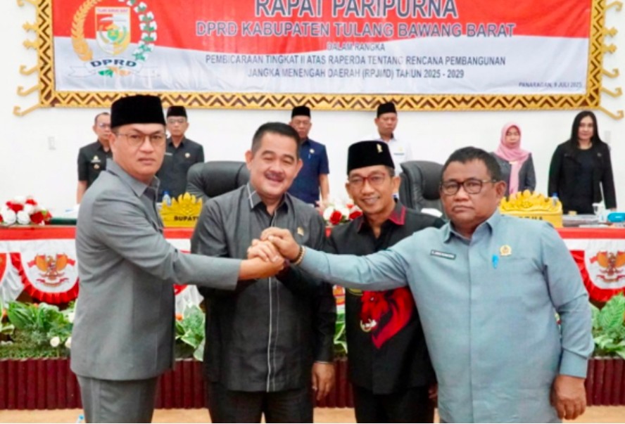 Dewan Perwakilan Rakyat Daerah (DPRD) Kabupaten Tulang Bawang Barat (Tubaba) menggelar rapat paripurna pembicaraan tingkat II untuk menyetujui bersama Rancangan Peraturan Daerah (Ranperda) tentang Rencana Pembangunan Jangka Menengah Daerah (RPJMD) Kabupaten Tulang Bawang Barat tahun 2025–2029. Rapat berlangsung di Ruang Sidang Kantor DPRD setempat, Rabu (9/7/2025).