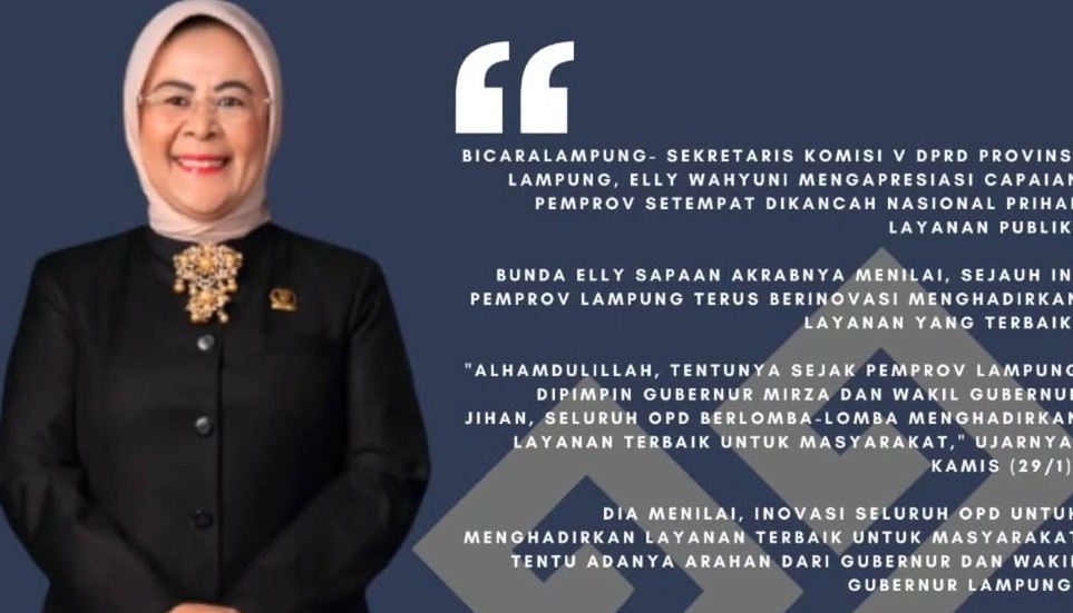 Sekretaris Komisi V DPRD Provinsi Lampung, Elly Wahyuni, atau akrab disapa Bunda Elly, memberikan apresiasi atas capaian ini. Menurutnya, inovasi layanan publik yang terus dilakukan oleh seluruh Organisasi Perangkat Daerah (OPD) merupakan bukti komitmen Pemprov Lampung dalam memberikan pelayanan terbaik bagi masyarakat.