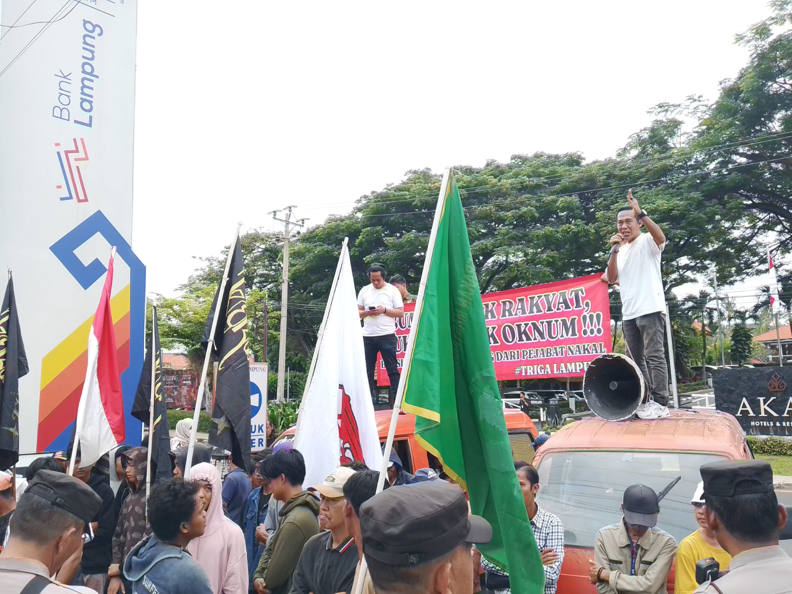 Tiga organisasi sipil(Triga Lampung) , yakni Aliansi Komando Aksi Rakyat (AKAR), Koalisi Rakyat Madani (KERAMAT), dan Pergerakan Masyarakat Analisis Kebijakan (PEMATANK) menggelar aksi demo di depan kantor Bank Lampung pada kamis, (18/ 09/2025).