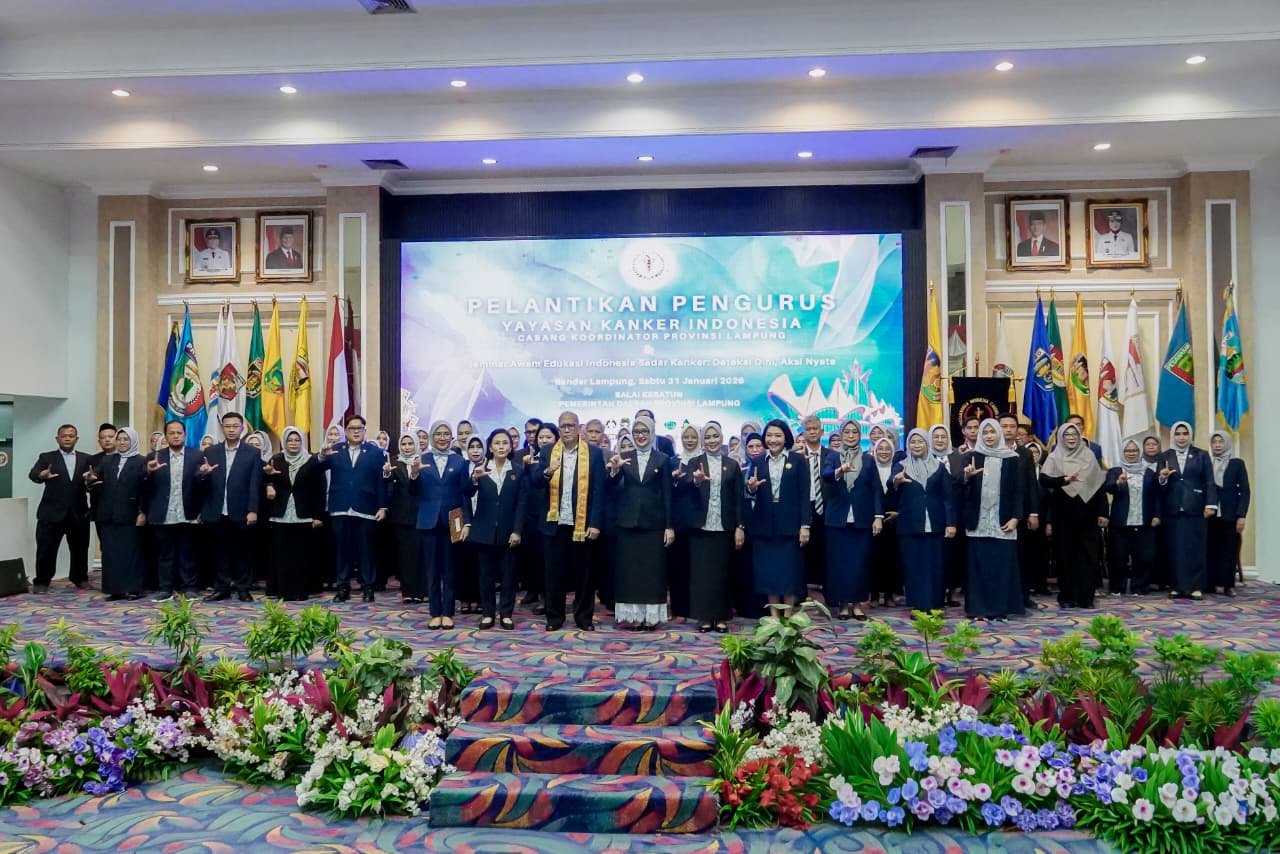 Bandar Lampung —- Wakil Gubernur Jihan Nurlela resmi dilantik sebagai Ketua Yayasan Kanker Indonesia (YKI) Cabang Koordinator Provinsi Lampung masa bakti 2025-2030. Prosesi pelantikan dipimpin langsung oleh Ketua YKI Pusat, Prof. Dr. dr. Aru W. Sudoyo, Sp.PD-KHOM, di Balai Keratun Lt. III, Sabtu (31/1/2026).