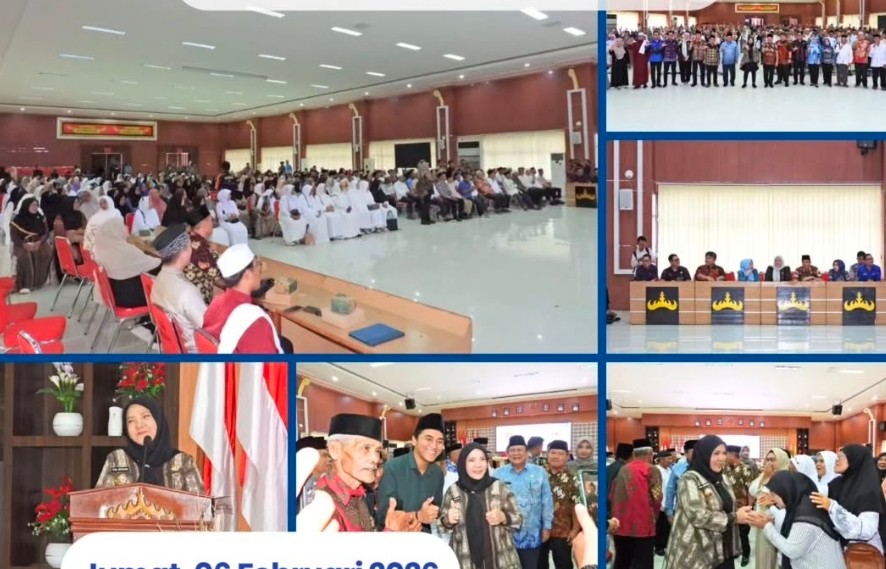 Wali Kota Bandar Lampung, Hj. Eva Dwiana, menghadiri sekaligus memberikan sambutan pada kegiatan Manasik Umroh Tahap Pertama Kota Bandar Lampung Tahun 2026 yang dilaksanakan di Aula Gedung Semergo, Kantor Pemerintah Kota Bandar Lampung, Jumat (6/2/2026).